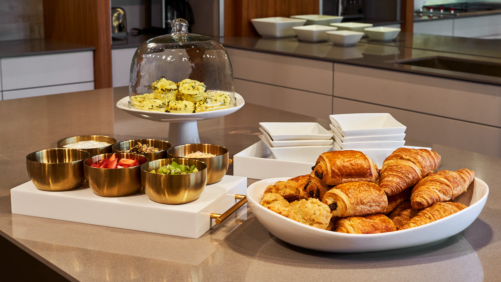 croissants, chocolatines, assorted seasonal muffins + loaves, sliced melons + berries, individual yogurts